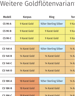 Entdecken Sie unsere Goldflöten in 9, 14, 18 und 24 Karat Gold sowie Platin in verschiedenen Ausführungen, individuell auf Ihre Wünsche zugeschnitten.
