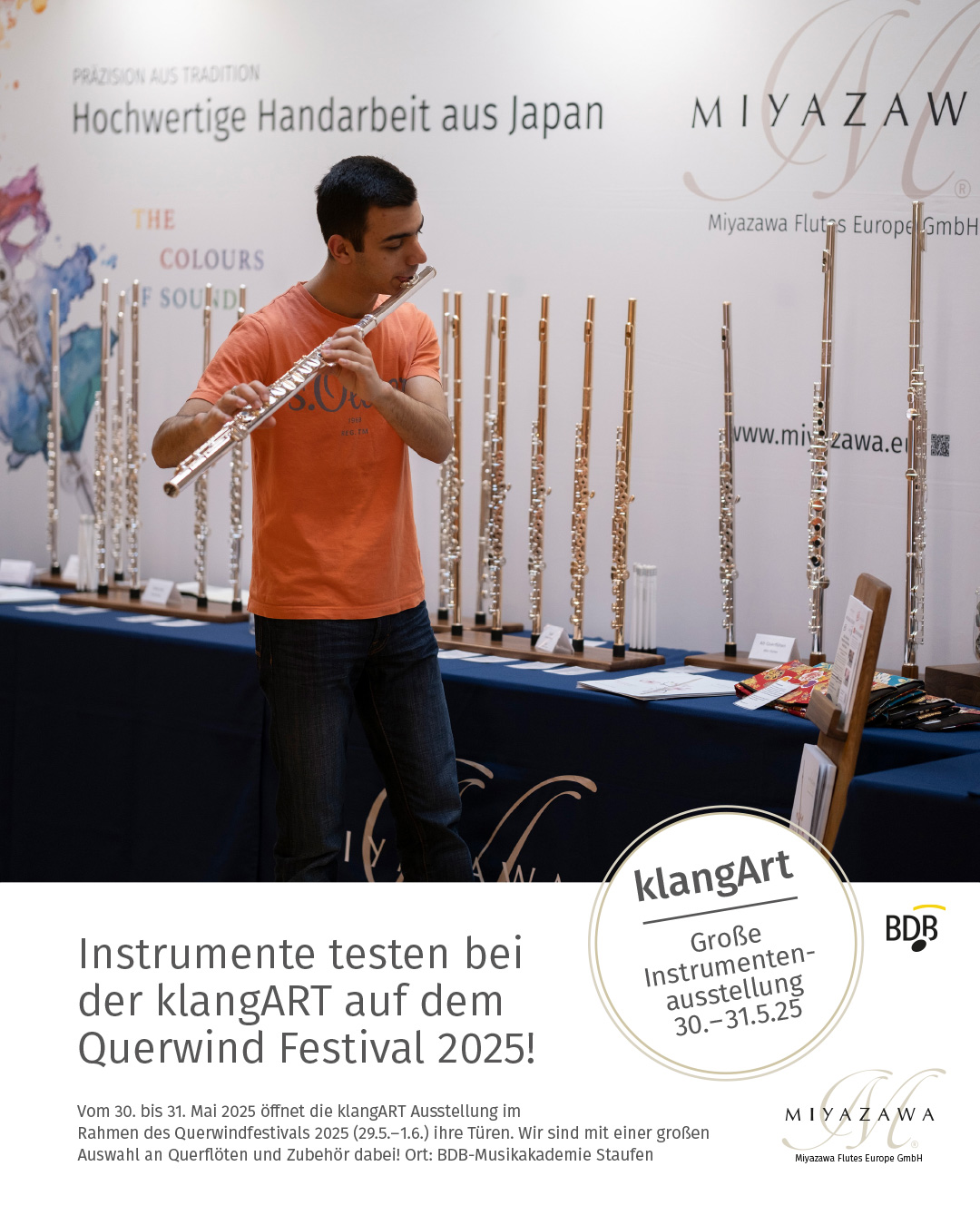 - Miyazawa Flutes Europe wird während der Sonderausstellung vor Ort sein und ausführlich zu den unterschiedlichen Modellen beraten.